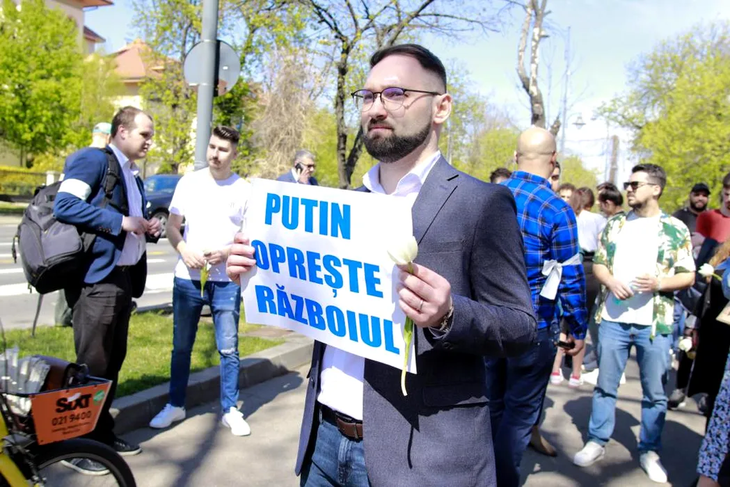 FOTO | Organizația de Tineret a PMP, protest în fața Ambasadei Federației Ruse din București. „Masacrele din ultimele săptămâni trebuie să înceteze”
