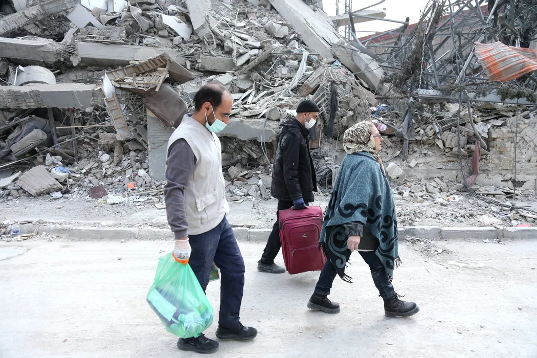 People walk past damaged buildings in Tehran, Iran, March 12, 2026. Photo by Xinhua/Shadati/ABACAPRESS.COM