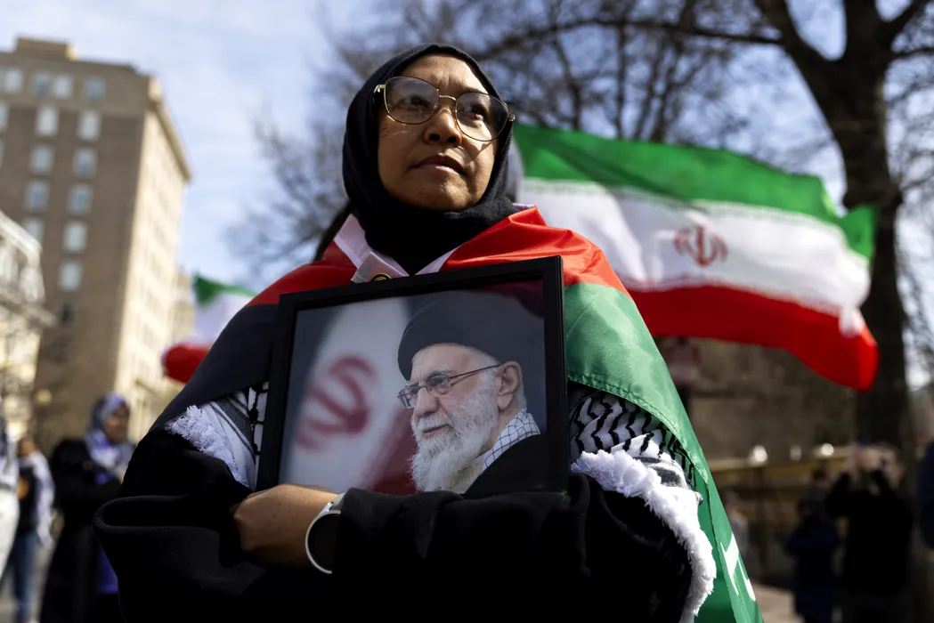 14 March 2026, US, Washington Dc: A woman holds a framed portrait of Ali Khamenei while protesters gather outside the White House to react to the U.S.-Israel's war on Iran on March 14, 2026, in Washington, DC. U.S.A. The conflict started on February 28, 2026, when the U.S. and Israel launched major airstrikes on Iran targeting military, nuclear, and leadership sites. Iran responded with missile and drone attacks across the Middle East, including U.S. bases and allied countries. Photo: Aashish Kiphayet/ZUMA Press Wire/dpa