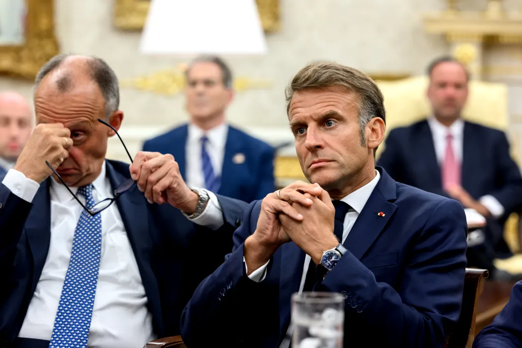 August 18, 2025, Washington, District Of Columbia, USA: German Chancellor Friedrich Merz, French President Emmanuel Macron, and other European leaders meet with President Donald Trump after his call with Russian President Vladimir Putin, Monday, August 18, 2025, in the Oval Office. (Credit Image: � Daniel Torok/White House/ZUMA Press Wire)