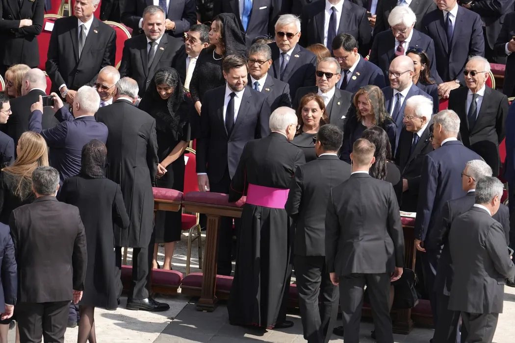 Vice President JD Vance, center, and his wife Usha, center left, attend the inaugural Mass of Pope Leo XIV's pontificate in St. Peter's Square at the Vatican, Sunday, May 18, 2025.,Image: 1000513781, License: Rights-managed, Restrictions: This content is intended for editorial use only. For other uses, additional clearances may be required.