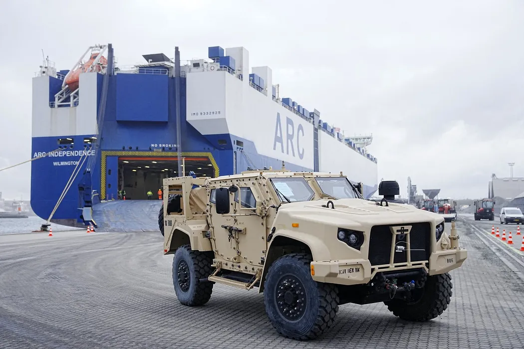 Un vehicul tactic ușor mixt (JLTV) al Armatei SUA părăsește nava purtătoare de vehicule ARC Independence după sosirea în portul Aarhus, Danemarca, pe 16 ianuarie 2023.
