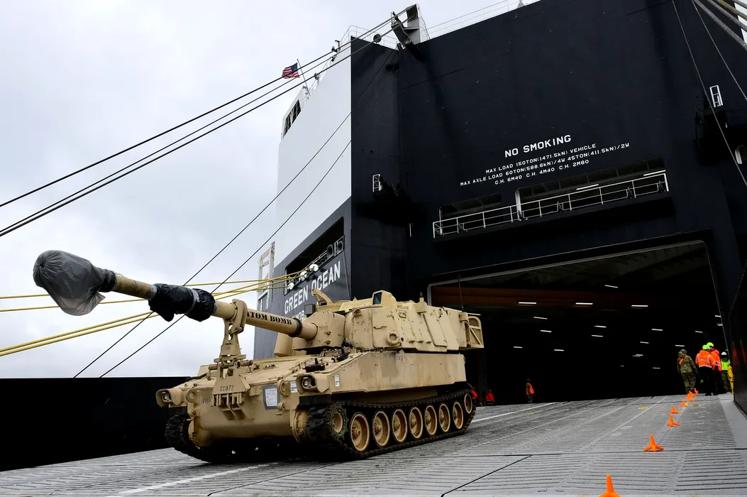 Un obuzier autopropulsat al Armatei SUA este descărcat de pe MV Green Ocean, în portul Kalundborg, 19 aprilie 2024, în Kalundborg, Danemarca.