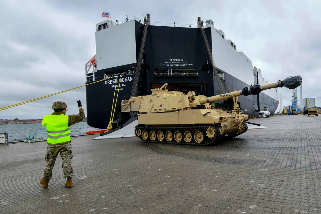 Un obuzier autopropulsat al Armatei SUA este descărcat de pe MV Green Ocean, în portul Kalundborg, 19 aprilie 2024, în Kalundborg, Danemarca.