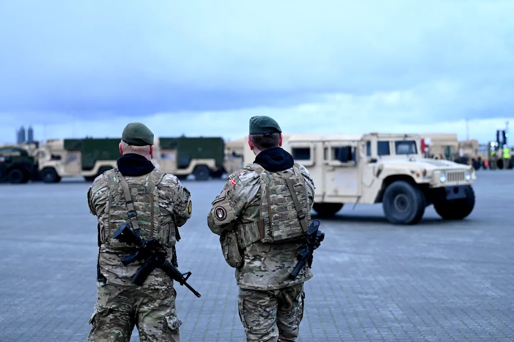 Danish soldiers patrol the area of the port of Aarhus, Denmark where military vehicles of the US army are parked, on January 16, 2023. 600 vehicles and containers belonging to the US 2nd Armored Brigade and 1st Cavalry Division will be transported to the eastern posts in Europe in accordance with planned US troop rotations. It is part of Denmark's 'Host Nation Support' to NATO.,Image: 750048885, License: Rights-managed, Restrictions: , Model Release: no