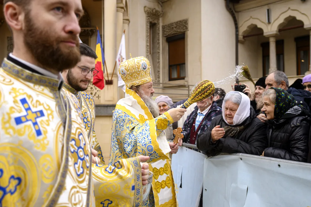 Patriarhul Bisericii Ortodoxe Romane Daniel stropeste cu aghiazma persoanele care au participat la slujba de Sfintire cea Mare a Apei, prilejuita de sarbatoarea Botezului Domnului - Boboteaza, la Catedrala Patriarhala din Bucuresti, marti, 6 ianuarie 2026. ALEXANDRU DOBRE / MEDIAFAX FOTO
