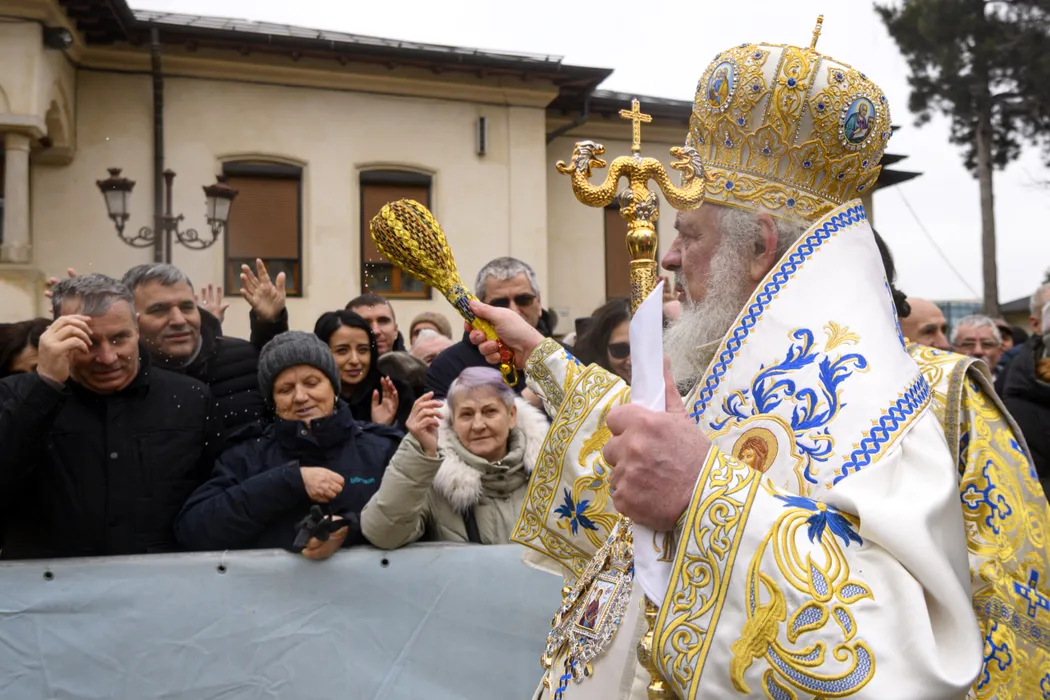 Patriarhul Bisericii Ortodoxe Romane Daniel stropeste cu agheasma persoanele care au participat la slujba de Sfintire cea Mare a Apei, prilejuita de sarbatoarea Botezului Domnului - Boboteaza, la Catedrala Patriarhala din Bucuresti, marti, 6 ianuarie 2026. ALEXANDRU DOBRE / MEDIAFAX FOTO