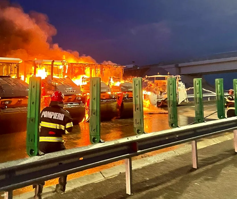 VIDEO | Patru utilaje de asfaltare de pe șantierul Drumului Expres Craiova-Pitești au luat foc, între Balș și Pielești. „Au fost distruse în proporție de aproximativ 70%”