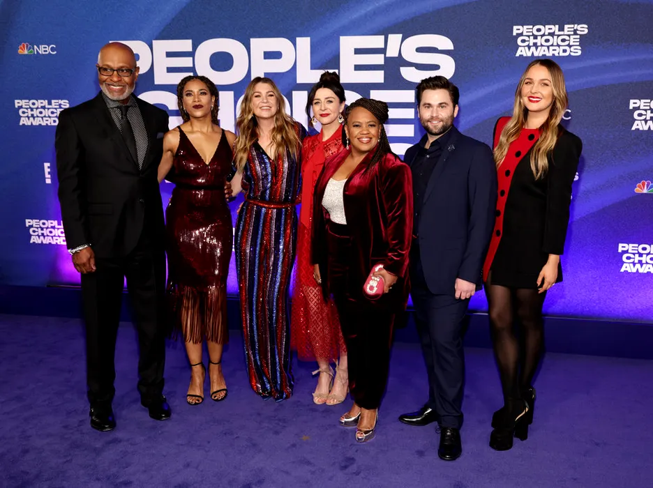2022 PEOPLE'S CHOICE AWARDS -- Pictured: (l-r) James Pickens Jr., Kelly McCreary, Ellen Pompeo, Caterina Scorsone, Chandra Wilson, Jake Borell, and Camilla Luddington arrive to the 2022 People's Choice Awards held at the Barker Hangar, on December 6, 2022 -- (Photo by: Todd Williamson/E! Entertainment/NBC)