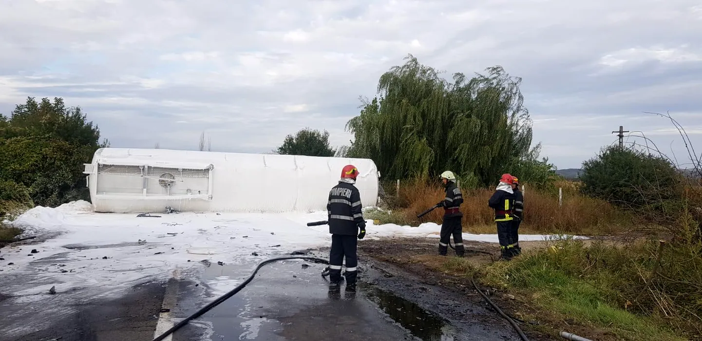 Pericol de explozie pe centura de est a Ploieștiului. O cisternă cu 32 de tone de kerosen, răsturnată pe carosabil (VIDEO)