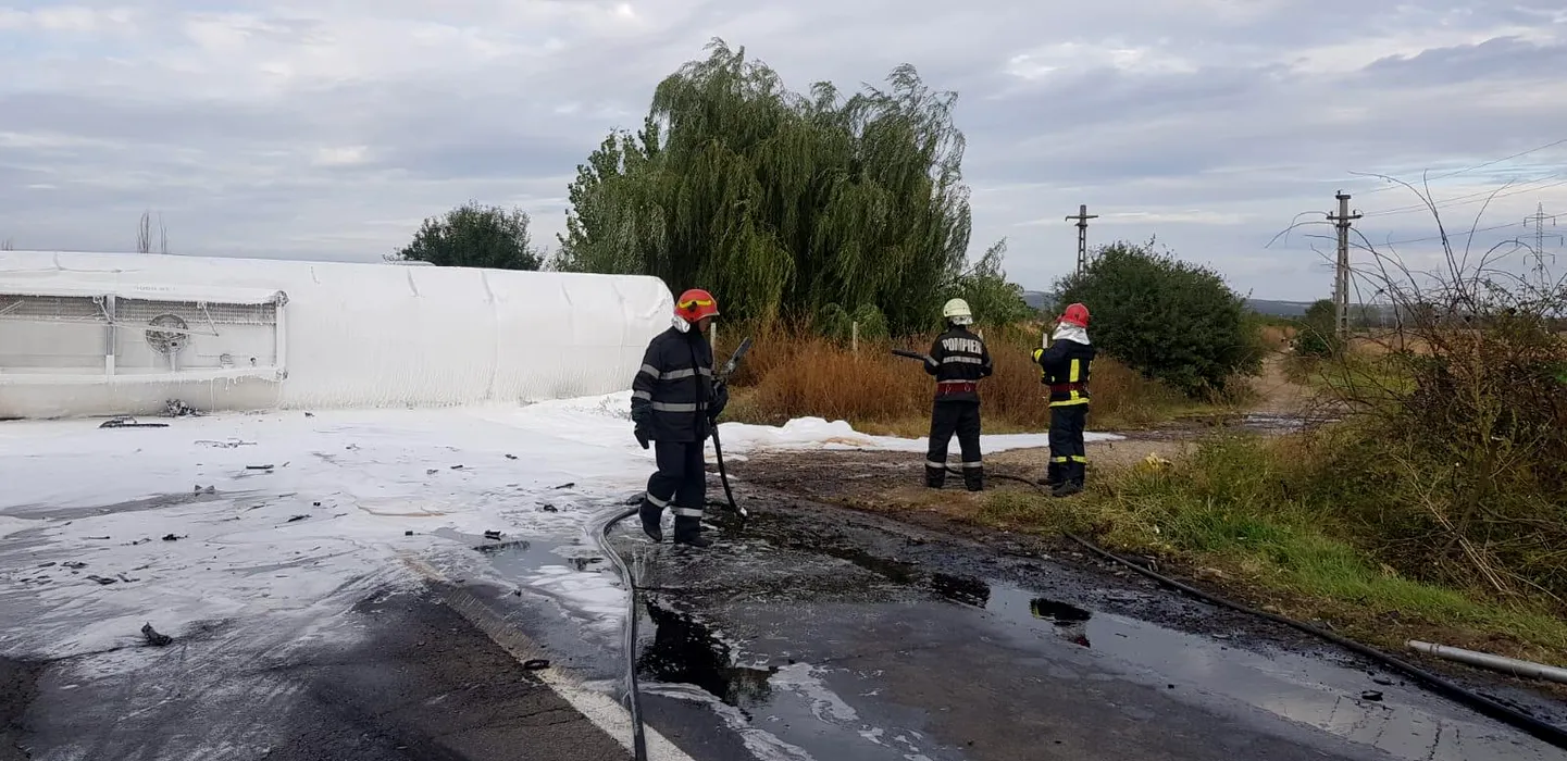 Pericol de explozie pe centura de est a Ploieștiului. O cisternă cu 32 de tone de kerosen, răsturnată pe carosabil (VIDEO)