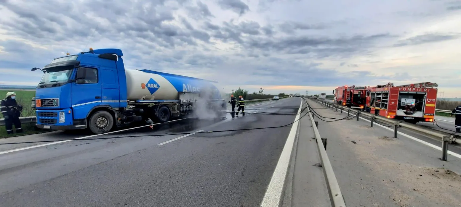 Pericol de explozie pe A1. Cisternă cu 30 tone de motorină, în flăcări pe autostradă, aproape de Pitești | FOTO-VIDEO