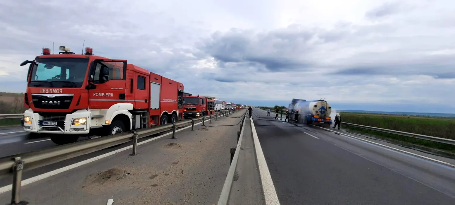 Pericol de explozie pe A1. Cisternă cu 30 tone de motorină, în flăcări pe autostradă, aproape de Pitești | FOTO-VIDEO