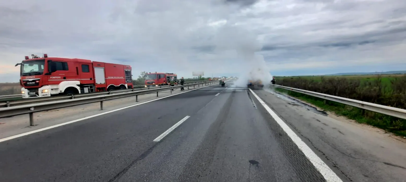 Pericol de explozie pe A1. Cisternă cu 30 tone de motorină, în flăcări pe autostradă, aproape de Pitești | FOTO-VIDEO