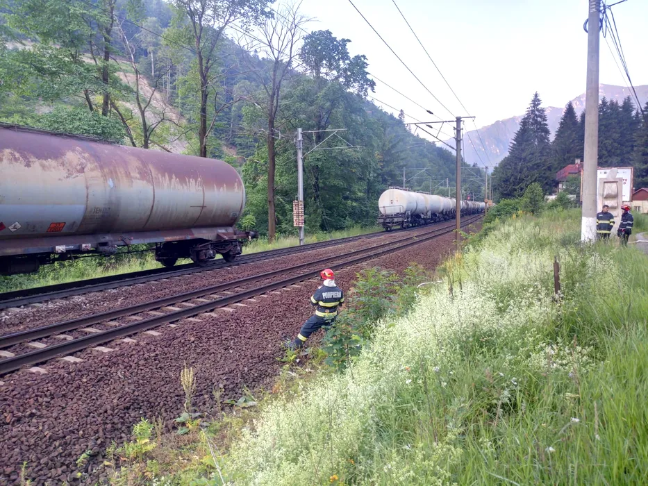 Pericol între Bușteni și Azuga. Incendiu la un vagon încărcat cu 56 de tone de benzină. Întregul tren este plin de combustibil