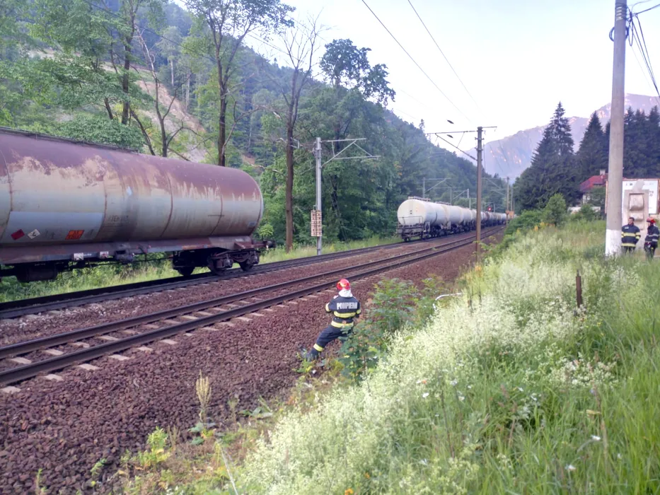 Pericol între Bușteni și Azuga. Incendiu la un vagon încărcat cu 56 de tone de benzină. Întregul tren este plin de combustibil