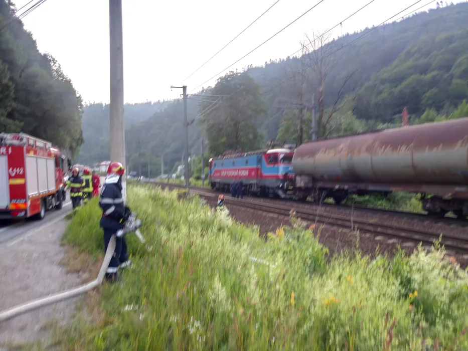 Pericol între Bușteni și Azuga. Incendiu la un vagon încărcat cu 56 de tone de benzină. Întregul tren este plin de combustibil