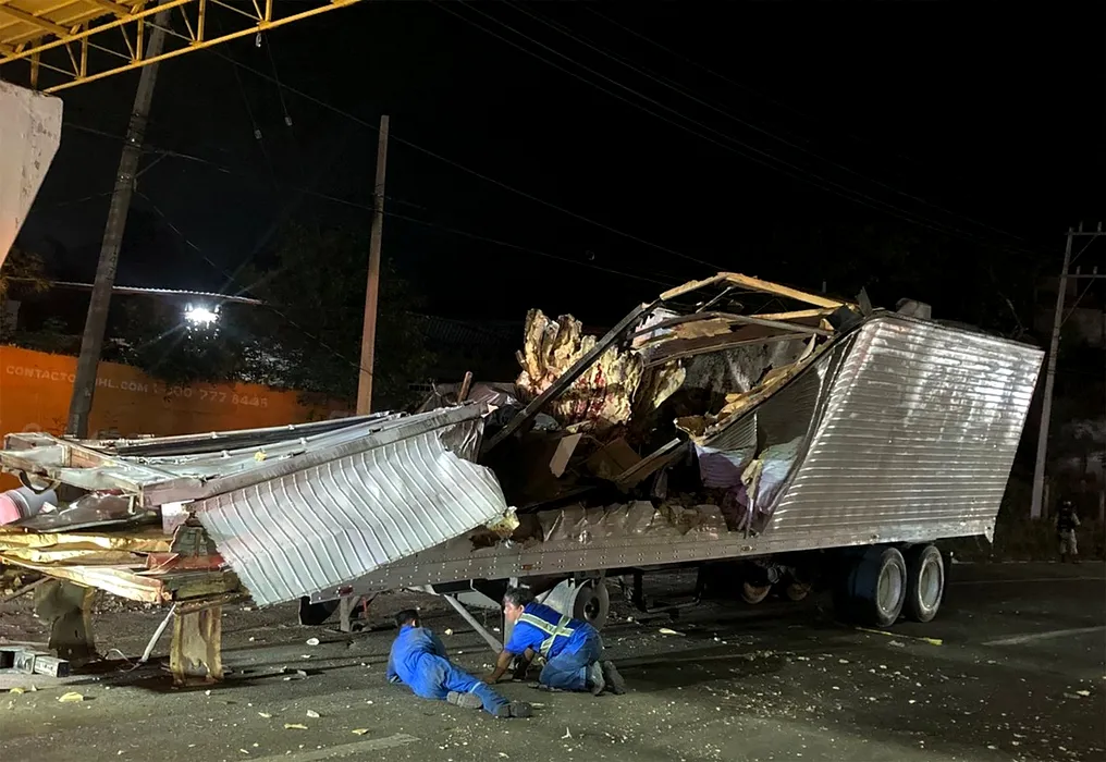 Workers remove the container from the trailer of a truck that crashed with migrants aboard during a road accident in Tuxtla Gutierrez, Chiapas state, Mexico, on December 9, 2021. At least 53 migrants were killed on December 9 in Mexico after the truck they were hiding in hit a retaining wall and overturned in the southern state of Chiapas, a major transit point for those trying to reach the United States.,Image: 647248891, License: Rights-managed, Restrictions: , Model Release: no, Credit line: Profimedia