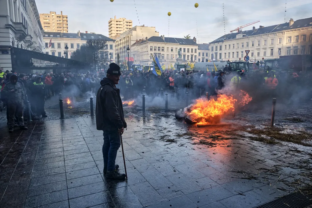 Few farmers set some fire at a protest action in the European district in Brussels, organized by several agriculture unions from Belgium but also other European countries on Thursday February 1, 2024 in Brussels, Belgium. ABS (Algemeen Boerensyndicaat), FWA, FAJ take part in the farmers' protests across Europe as they demand better conditions to grow, produce and maintain a proper income. Photo by Olivier Polet/ABACAPRESS.COM
