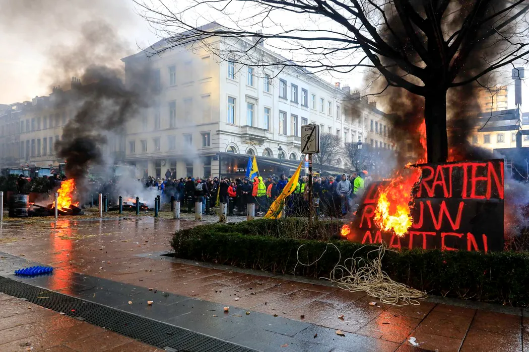BRUSSELS, BELGIUM - FEBRUARY 01: Some farmers set the tyres and banners on fire near the entrance of the European Parliament building during the farmer protest action as they demand to have better conditions to grow, produce and maintain a proper income, on the day of a special European Council meeting in Brussels, Belgium on February 1, 2024. Nicola Landemard / Anadolu