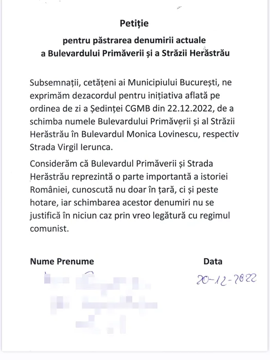 Petiție pentru păstrarea denumirii actuale a Bulevardului Primăverii și a Străzii Herăstrău. „Schimbarea nu se justifică în niciun caz prin vreo legătură cu regimul comunist”