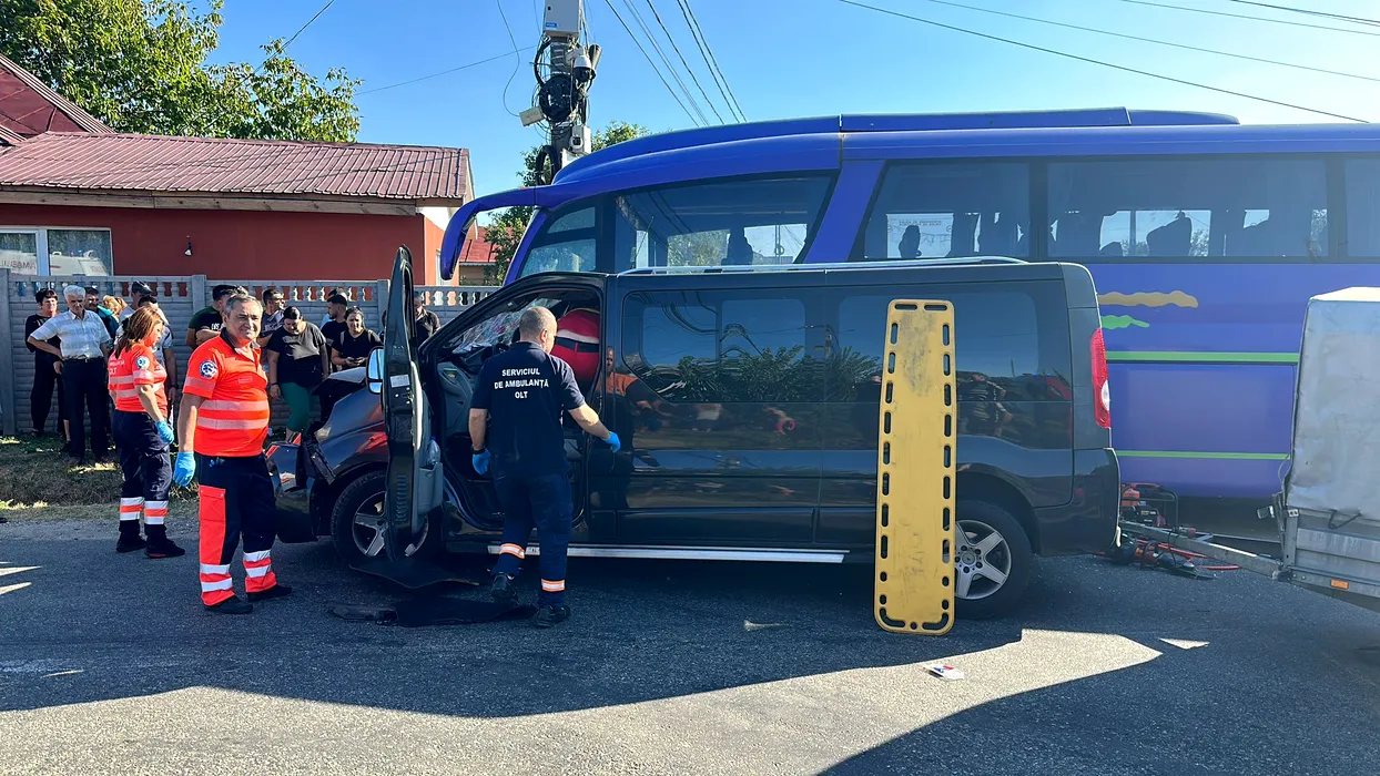 PLAN ROȘU de intervenție activat în Olt, după ce un autobuz și o autoutilitară s-au ciocnit. 55 de persoane, implicate în accident – FOTO