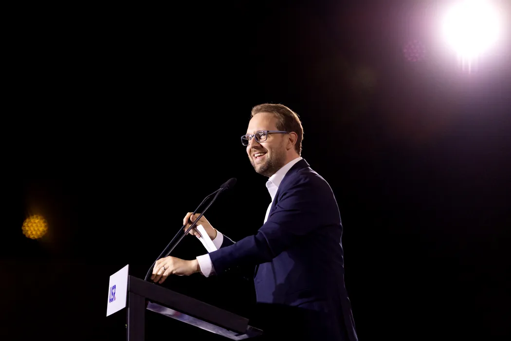 Presedintele USR, Dominic Fritz, participa la Congresul Uniunii Salvati Romania (USR), prin care partidul isi propune sa faca mai multe modificari la statut, desfasurat la Sibiu, vineri, 27 februarie 2026. OVIDIU MATIU / MEDIAFAX FOTO