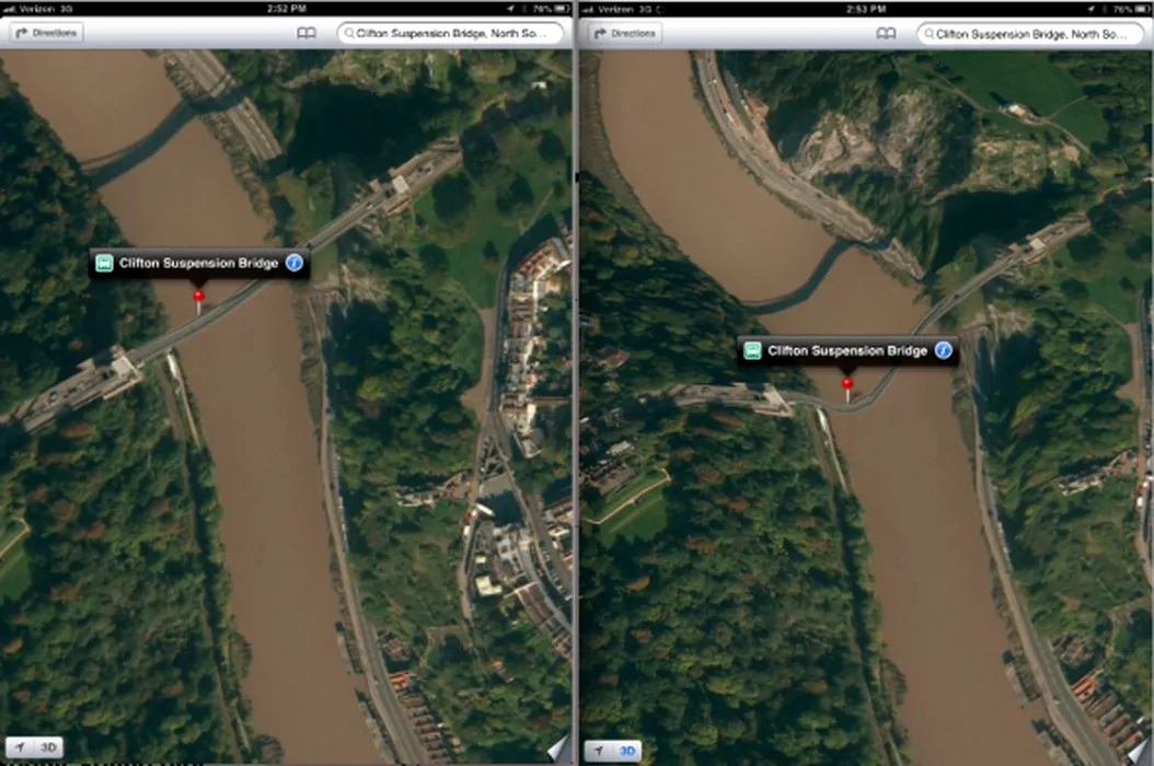 Poduri prăbușite, fast food într-un monument istoric sau benzină la magazinul de mobilă. Haosul din hărțile 3D ale sistemului iOS6