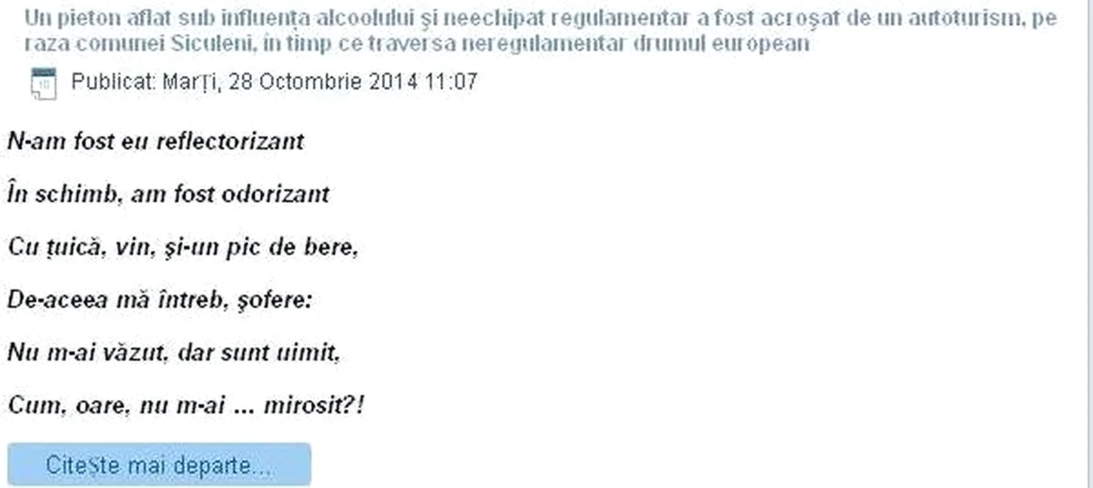 GALERIE FOTO: Polițistul de la IPJ Harghita care dă comunicate de presă în versuri: I-a dat cu-o scândură în piept/ Ca să-i arate că-i „deștept”/ Însă, aflând că-i cercetat,/ Abia acum s-a … „deșteptat”!