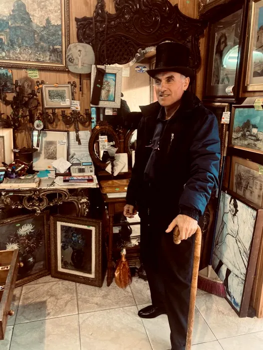 Iulian Preda, negustorul cu joben și baston, în magazinul său de antichități, artă și curiozități din București