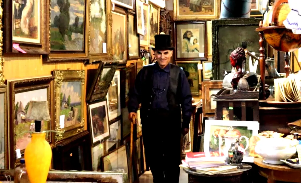 Iulian Preda, negustorul cu joben și baston, în magazinul său de antichități, artă și curiozități din București