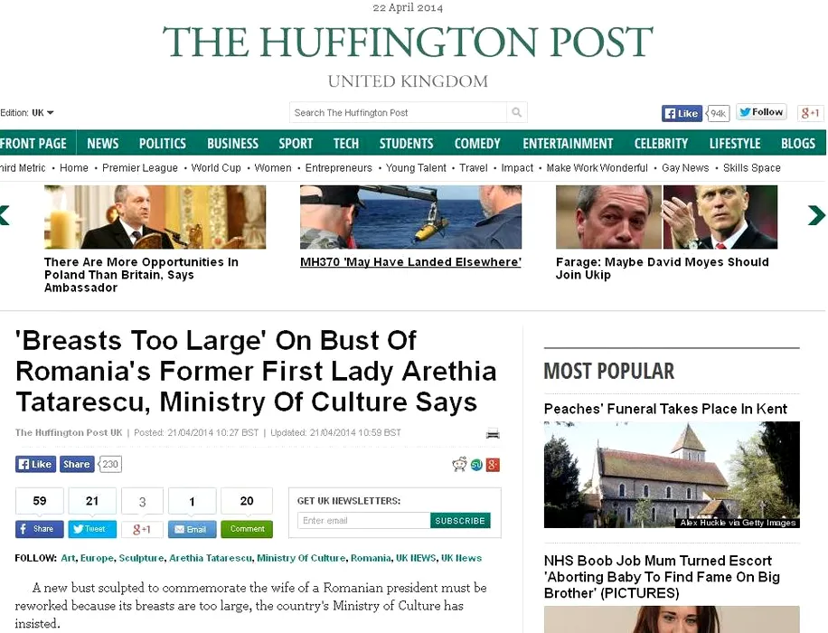 Povestea bustului prea generos al Arethiei Tătărăscu a ajuns în presa britanică: „Ministerul Culturii vrea să-i reducă sânii fostei prime doamne”