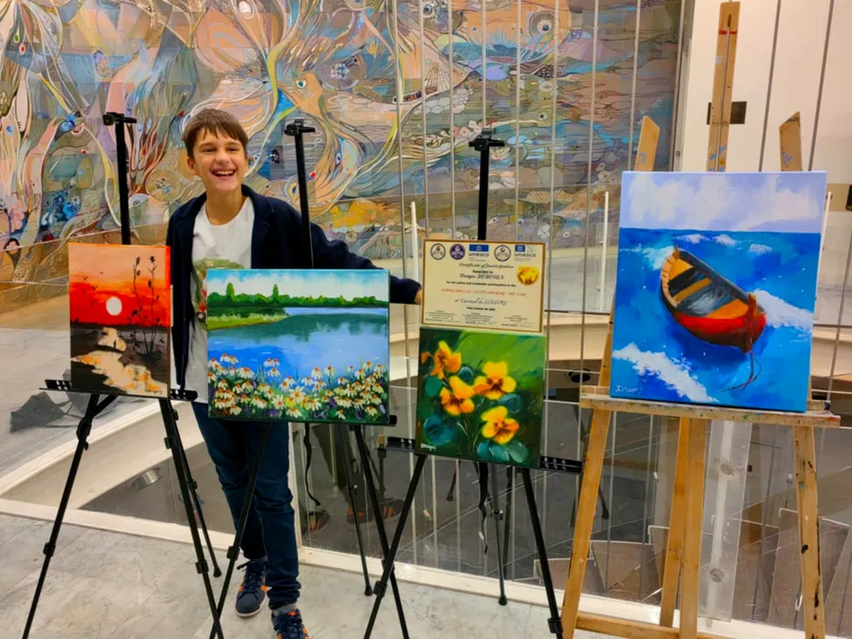 POVESTEA singurului copil român cu expoziții la UNESCO Paris, Dubai și Praga. Din atelierul „Mânuțe Fermecate” pe marile „tablouri” ale lumii