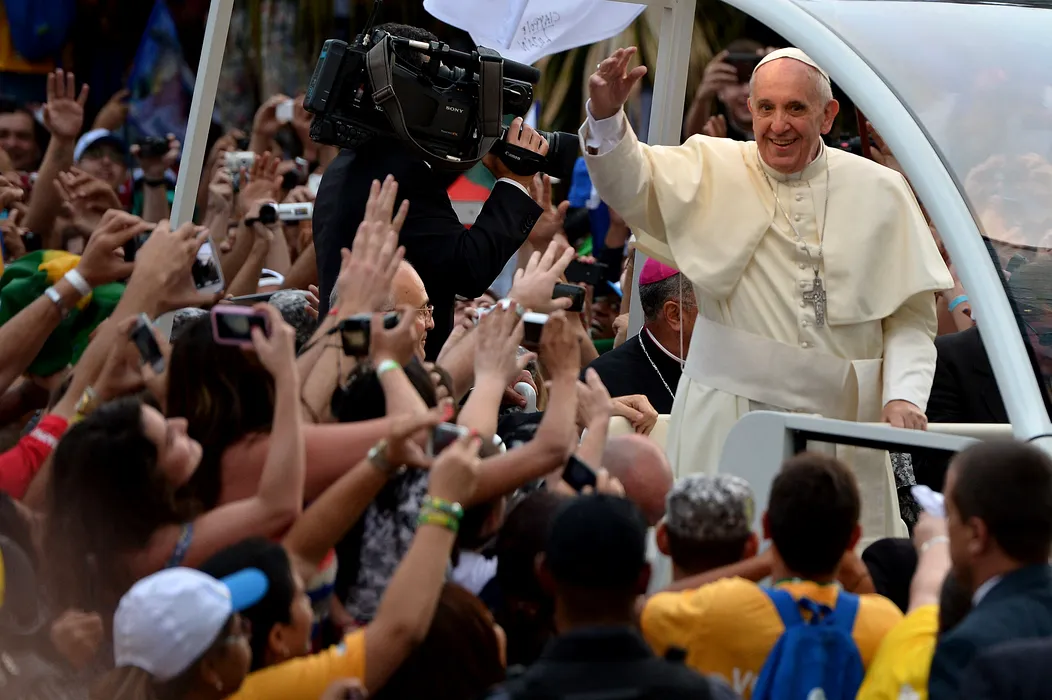 Pope Francis waves at faithfuls from the popemobile on his way to the Guanabara Palace after his arrival in Rio de Janeiro on July 22, 2013. Pope Francis landed in Brazil on Monday for his first overseas trip as pontiff to attend the international festival World Youth Day in Brazil, the world's biggest Catholic country.,Image: 166970031, License: Rights-managed, Restrictions: , Model Release: no