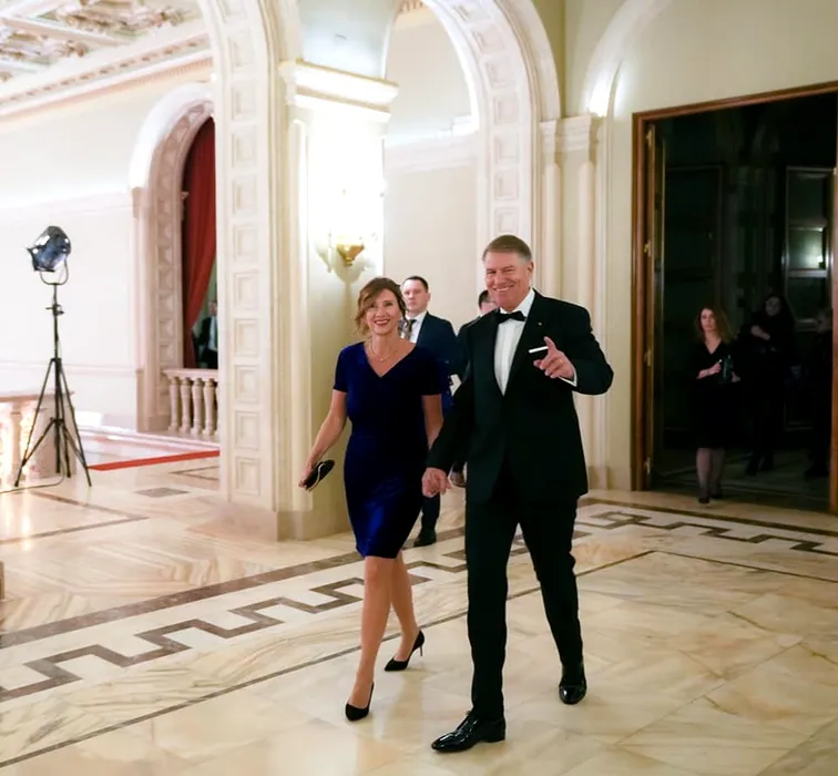 Sursă Foto - Facebook/Carmen Iohannis alături de președintele României, purtând rochia din catifea de culoarea albastru regal