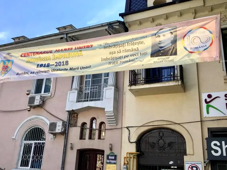 Primăria Sectorului 2, gafă uriașă: cum e scris pe un banner numele episcopului Iuliu Hossu, cel care a citit declarația Marii Uniri din 1918. GALERIE FOTO