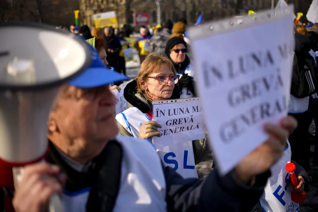 Profesorii și studenții protestează sub geamul lui Bolojan, pe fond asurzitor de vuvuzele. „Nu ne tăia speranța!”/”Vrem grevă generală”