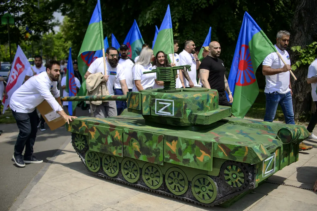FOTO | Protest al romilor în fața Ambasadei Rusiei de la București. Motivul pentru care au adus un tanc în miniatură cu inscripția armatei ruse