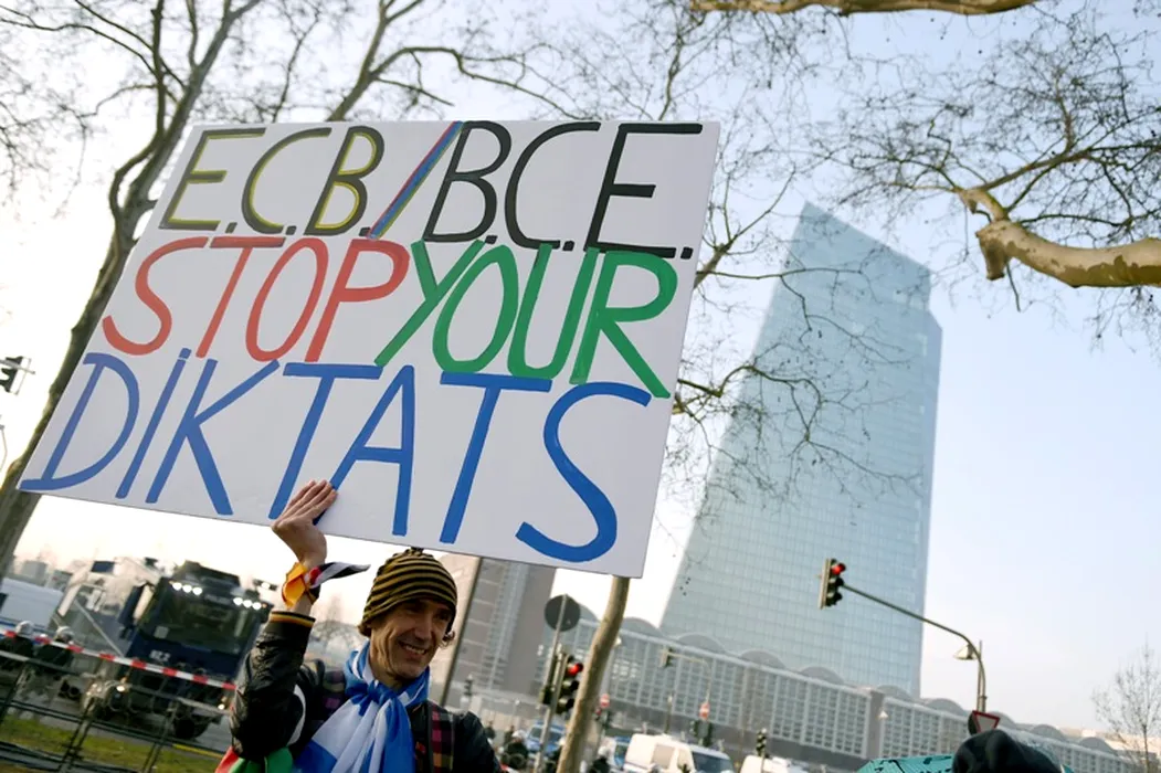 Protest în interiorul Băncii Centrale Europene. O femeie s-a urcat pe pupitru și a făcut un gest neașteptat