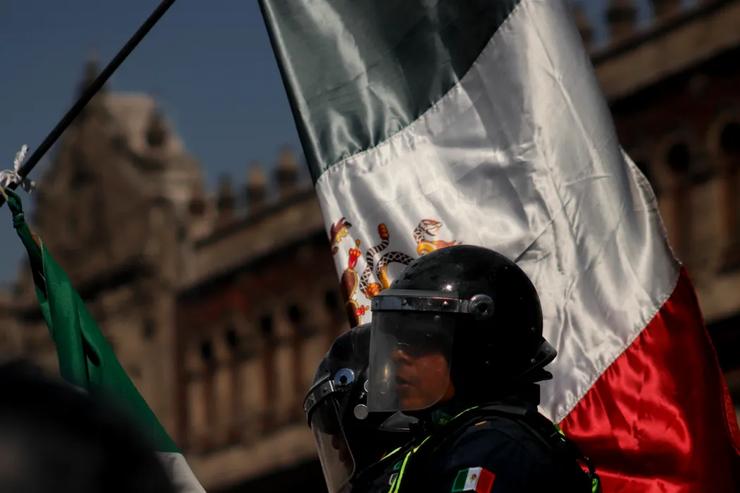 15 November 2025, Mexico, Mexico City: A Mexican Policeman stands next to a flag during a demonstration against the Mexican government following the murder of Uruapan Mayor Carlos Manzola. Photo: Carlos Santiago/eyepix via ZUMA Press Wire/dpa