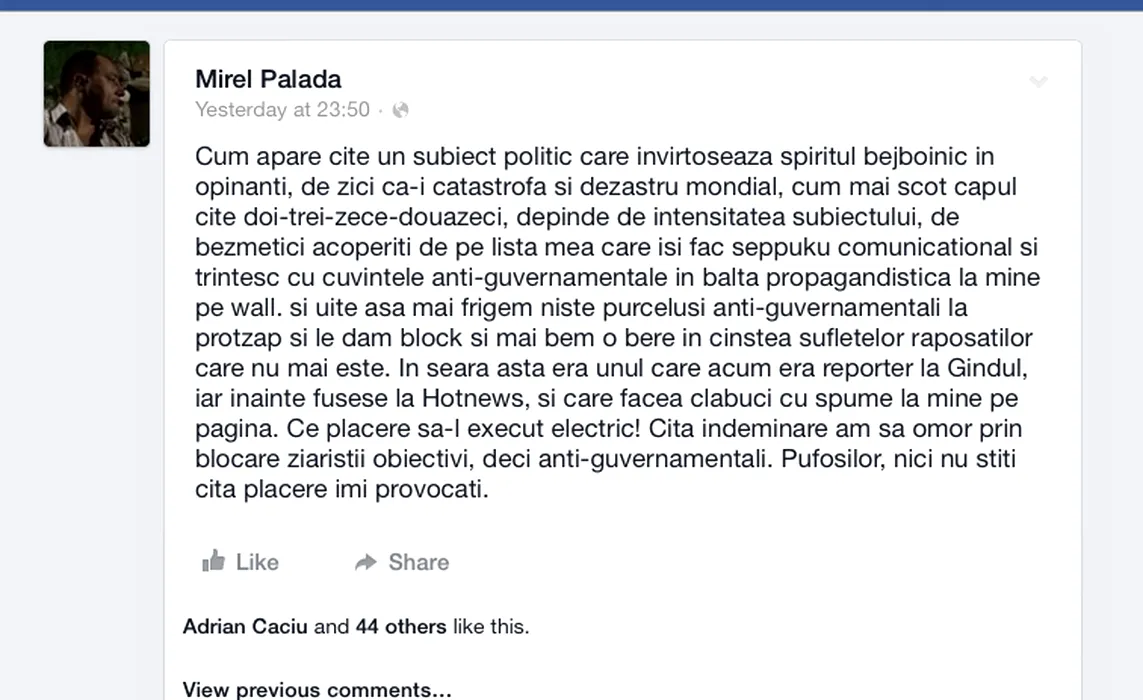 Purtătorul de cuvânt al Guvernului, Mirel Palada: „Ce plăcere să-l execut electric! Câtă îndemânare am să omor prin blocare ziariștii obiectivi, deci anti-guvernamentali”