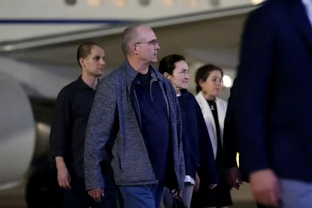 Paul Whelan, center, and Evan Gershkovich, left, arrive at Kelly Field after being released by Russia, Friday, Aug. 2, 2024, in San Antonio.,Image: 895210433, License: Rights-managed, Restrictions: This content is intended for editorial use only. For other uses, additional clearances may be required., Model Release: no, Pictured: Evan Gershkovich,Paul Whelan
