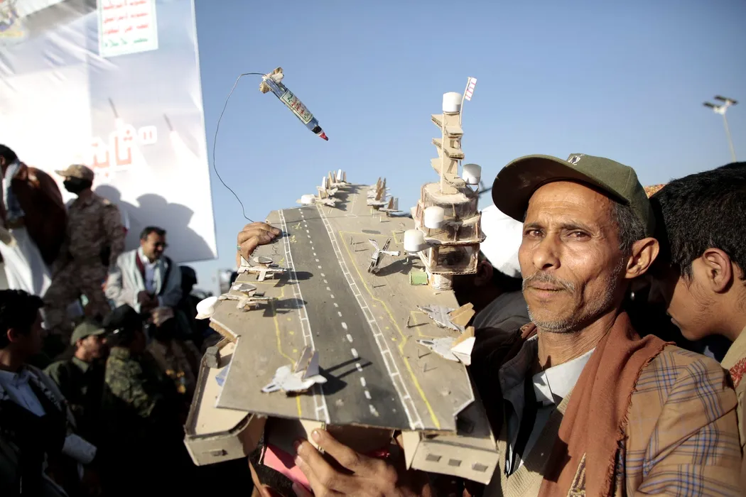 Susținătorii Huthi în timpul unui protest împotriva Israelului, în Sanaa, Yemen.