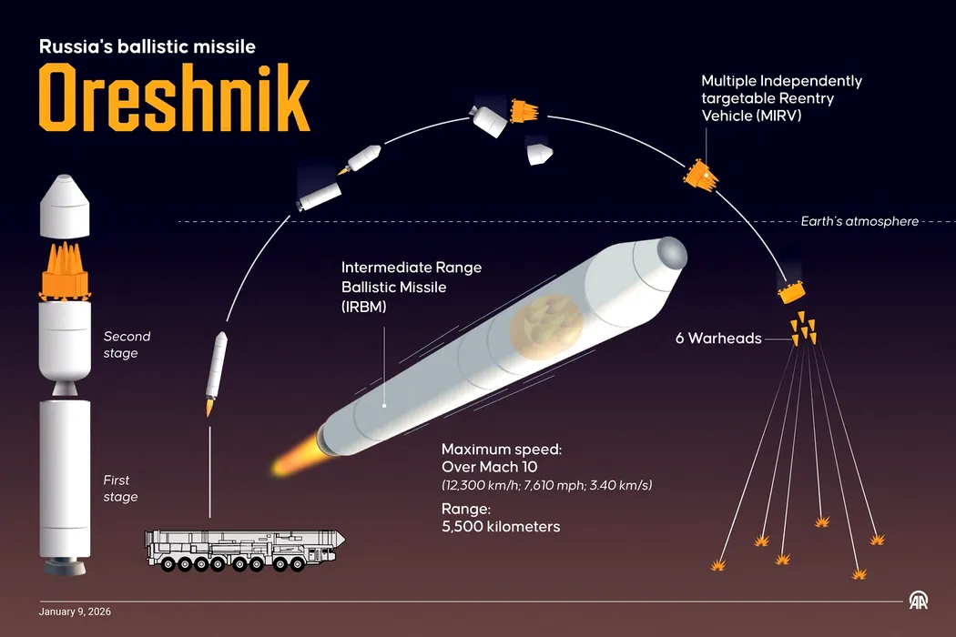 ANKARA, TURKIYE - JANUARY 9: An infographic titled "Russia's ballistic missile Oreshnik" created in Ankara, Turkiye on January 9, 2026. Omar Zaghloul / Anadolu/ABACAPRESS.COM,Image: 1064473017, License: Rights-managed, Restrictions: , Model Release: no, Credit line: AA/ABACA / Abaca Press / Profimedia