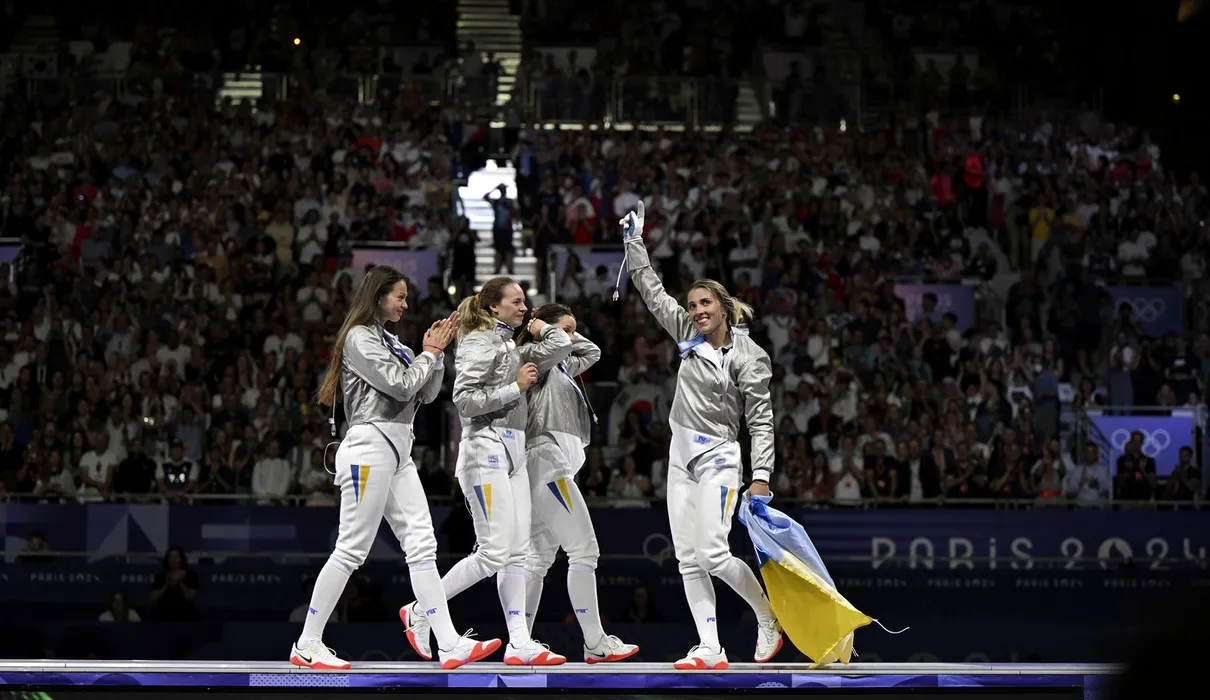 Ukraine's team members react after winning the gold medal in the women's fencing sabre team at the Paris Olympics at the Grand Palais in Paris, France, on August 3, 2024. ( The Yomiuri Shimbun ),Image: 895733854, License: Rights-managed, Restrictions: This content is intended for editorial use only. For other uses, additional clearances may be required.