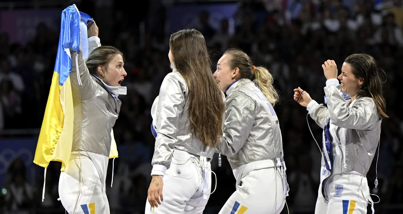 Ukraine's team members react after winning the gold medal in the women's fencing sabre team at the Paris Olympics at the Grand Palais in Paris, France, on August 3, 2024. ( The Yomiuri Shimbun ),Image: 895733887, License: Rights-managed, Restrictions: This content is intended for editorial use only. For other uses, additional clearances may be required.