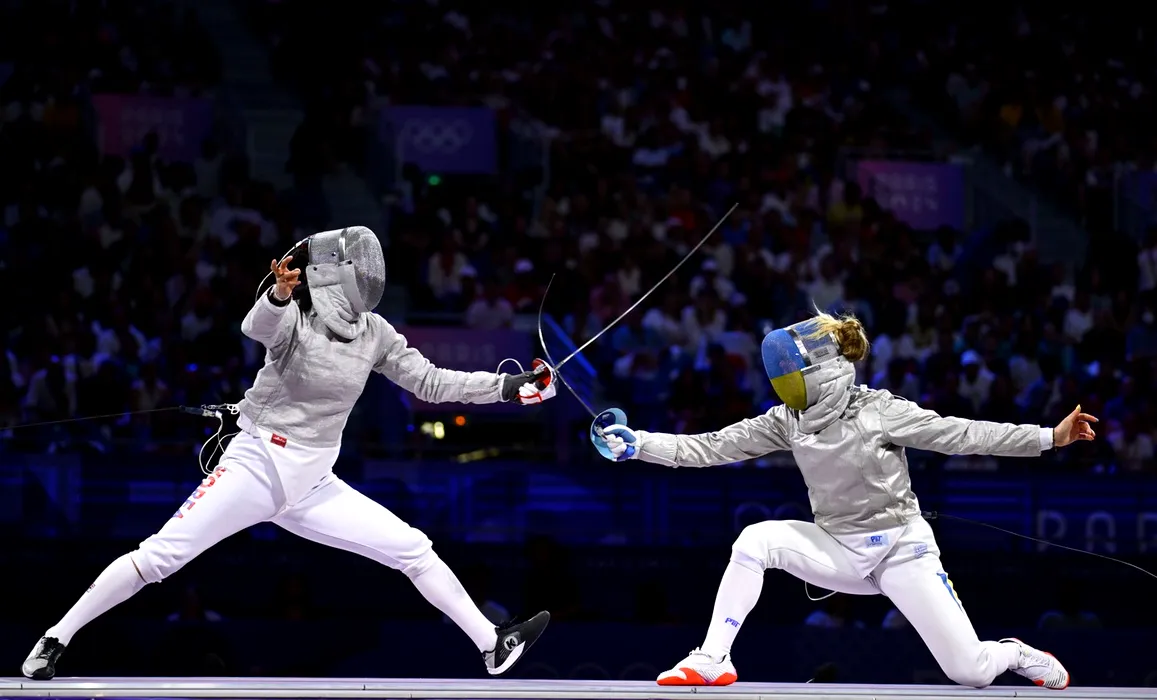 PARIS, Aug. 3, 2024 -- Olga Kharlan (R) of Ukraine competes against Choi Sebin of South Korea react during the women's sabre team gold medal match of fencing between Ukrain and South Korea at the Paris 2024 Olympic Games in Paris, France, Aug. 3, 2024.,Image: 895724738, License: Rights-managed, Restrictions: , Model Release: no