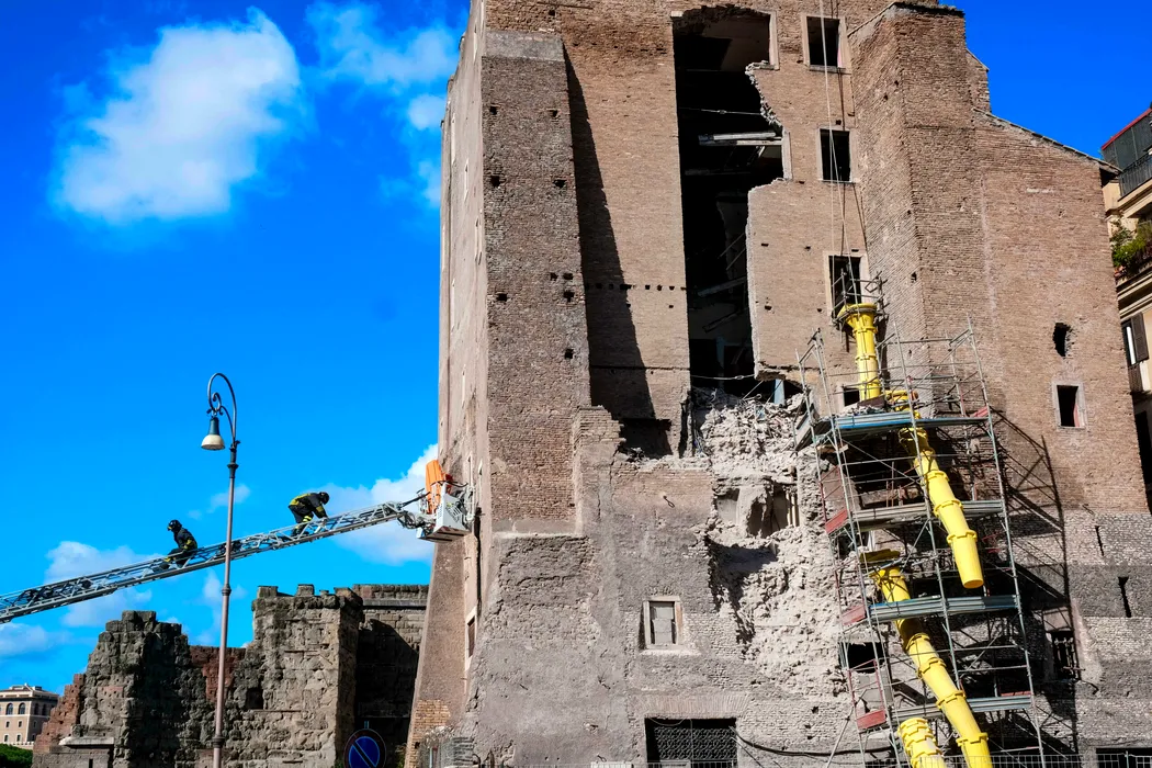 Turnul Torre dei Conti, o clădire medievală de pe Via dei Fori Imperiali, s-a prăbușit pe 3 noiembrie, chiar în timp ce muncitori executau lucrări de consolidare Foto Mediafax