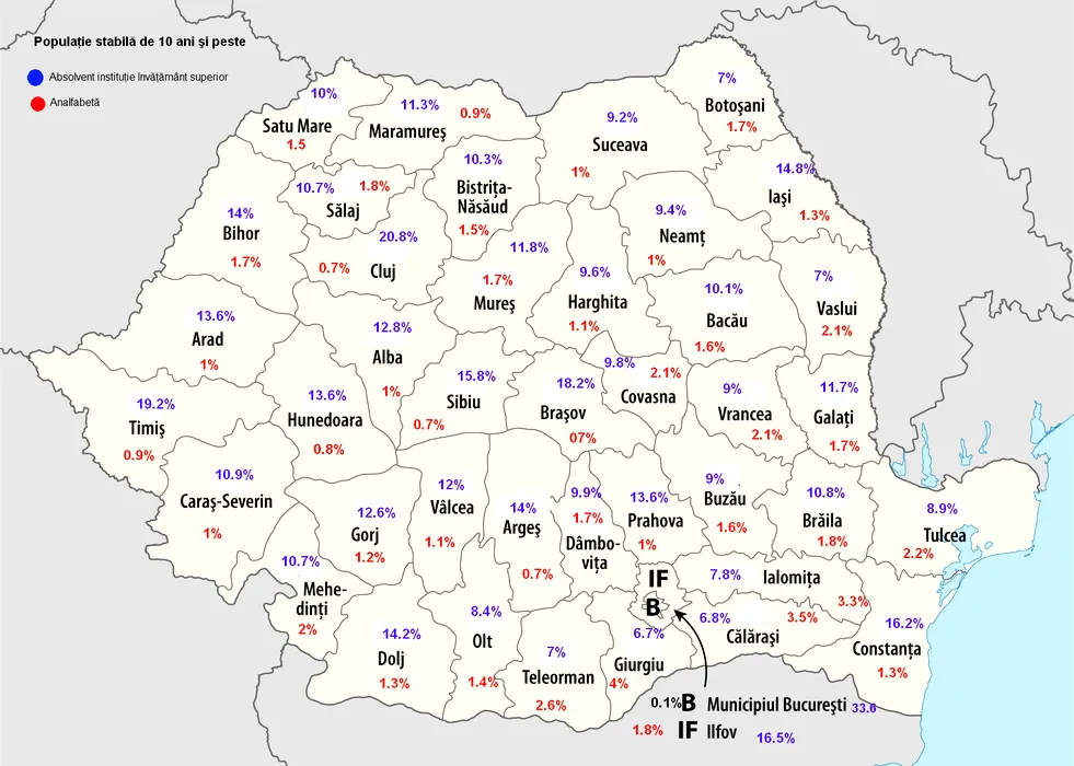 RECENSĂMÂNT. Harta absolvenților și analfabeților din România