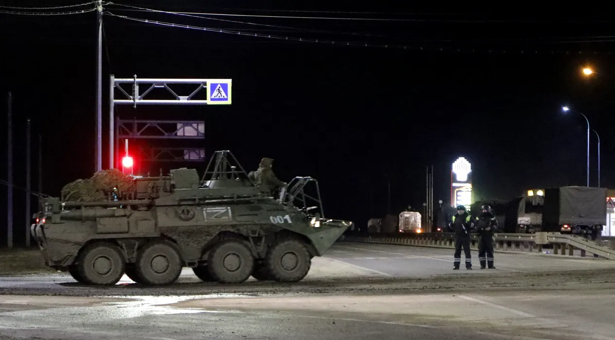 8125730 24.02.2022 An armoured vehicle with the letter 'Z' on it, drives along a road near the border between Russia and Ukraine in Belgorod region, Russia. On February 24 Russian President Vladimir Putin announced a military operation in Ukraine following recognition of independence of breakaway Donbas republics. Anton Vergun / Sputnik
